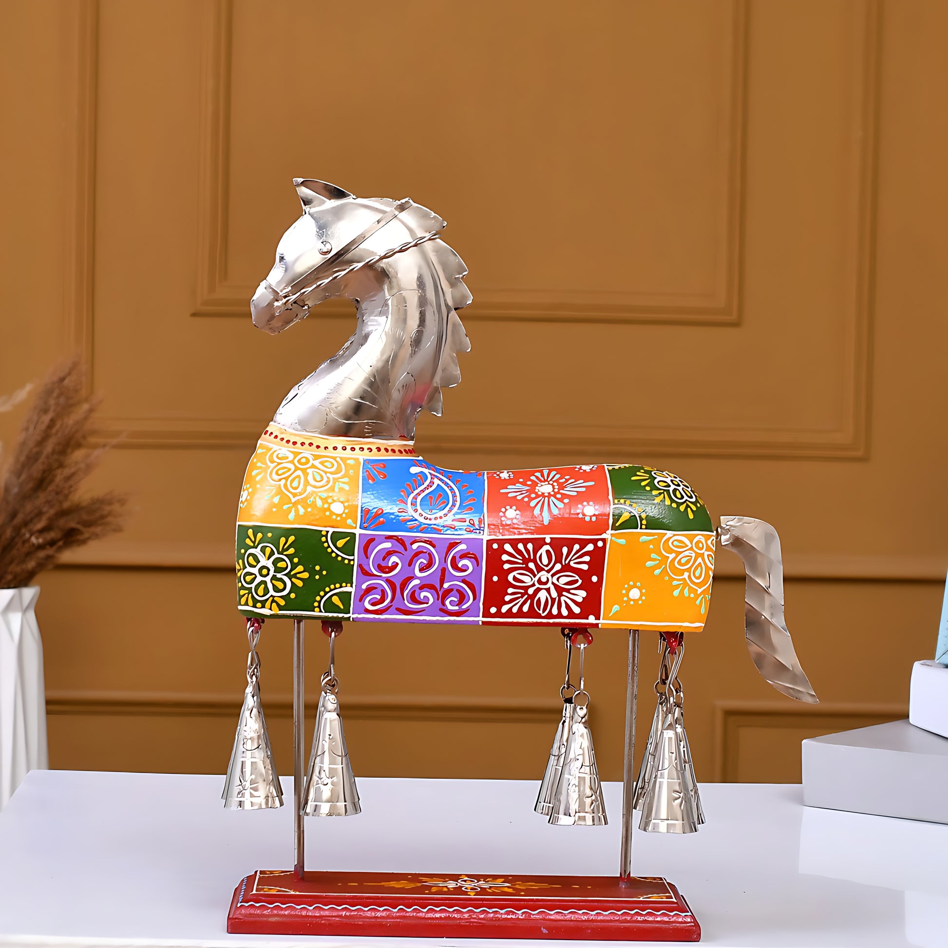 Add a vibrant touch of Indian folk art to your décor with this Handcrafted Multicolor Metal Horse Showpiece with Hanging Bells. Featuring a silver-toned horse paired with colourful patchwork painting and metal bells, this artistic piece is perfect for enhancing any modern or traditional space.