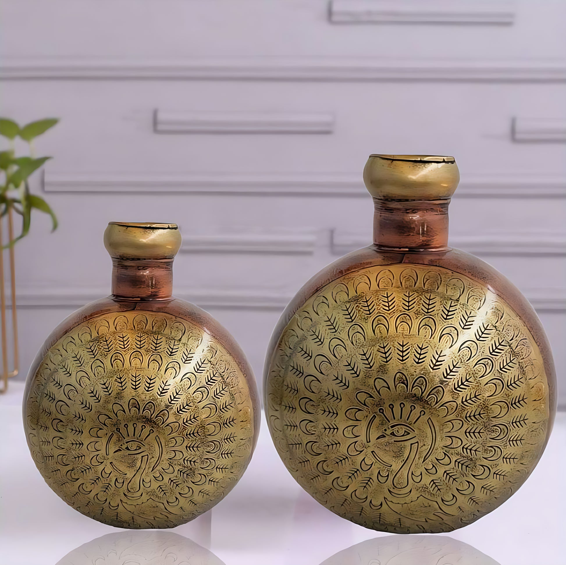 Enhance your décor with this Handcrafted Etched Metal Vase Set (Set of 2), featuring beautiful antique gold detailing and traditional engraved patterns. These round decorative vases add a luxurious, artistic touch to living rooms, hallways, offices, and festive setups.